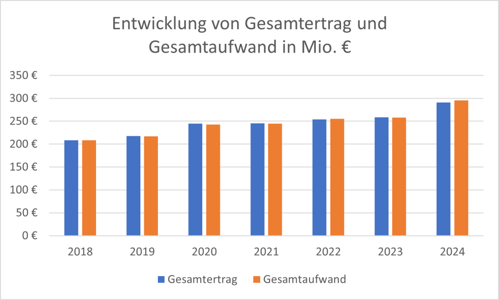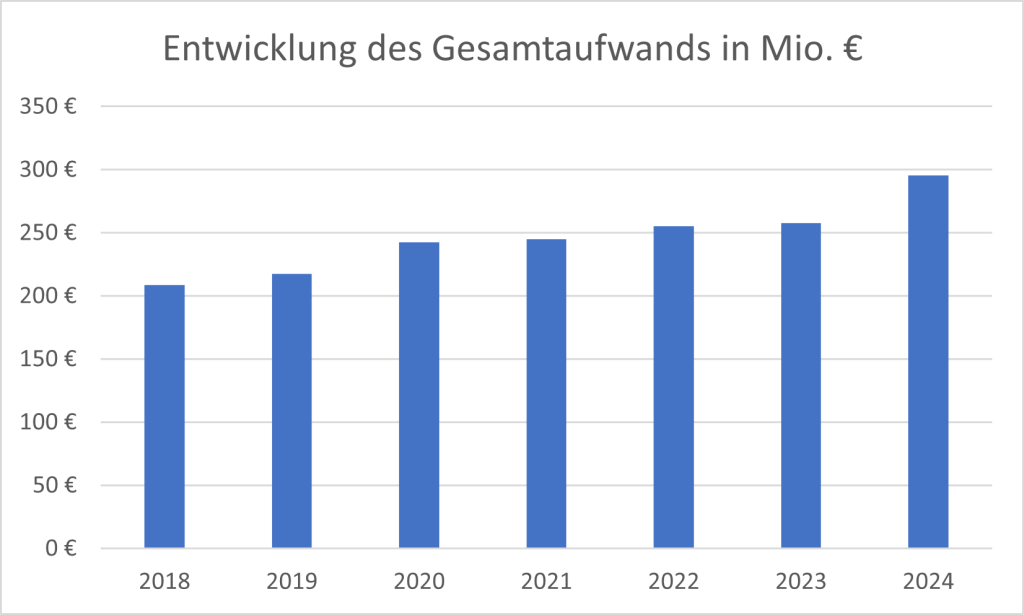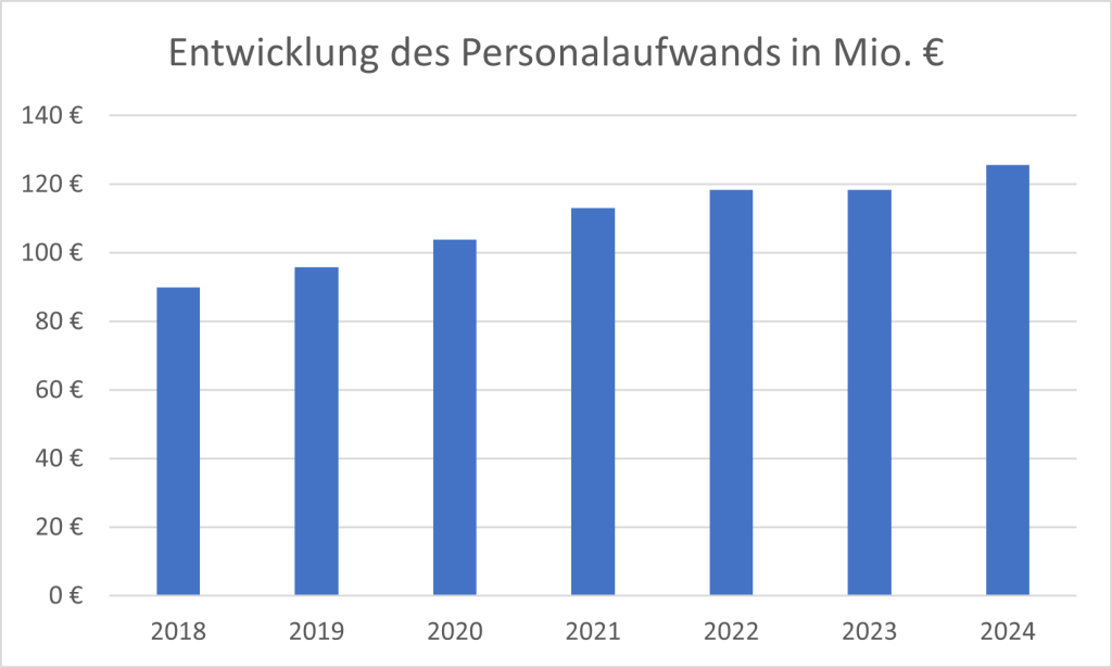 Der Personalaufwand stellt einen der wesentlichen Kostenfaktoren dar. Bedingt durch einen Anstieg der Beschäftigtenzahl und durch höhere Tarif-Entgelte ist der Personalaufwand von 90 Mio. € im Jahr 2018 um rund 40 Prozent auf 126 Mio. € im Jahr 2024 angewachsen.