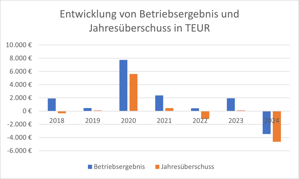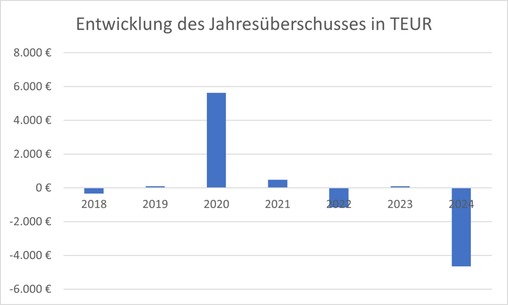Ab dem Geschäftsjahr 2021 verschlechterte sich die wirtschaftliche Gesamtlage jedoch spürbar, was zu einem deutlichen Rückgang des Jahresüberschusses führte. Nach einem lediglich geringfügigen Gewinn im Jahr 2023 wurde im Jahr 2024 mit einem Verlust von rund 4.649 TEUR das bisher schwächste Ergebnis verzeichnet.