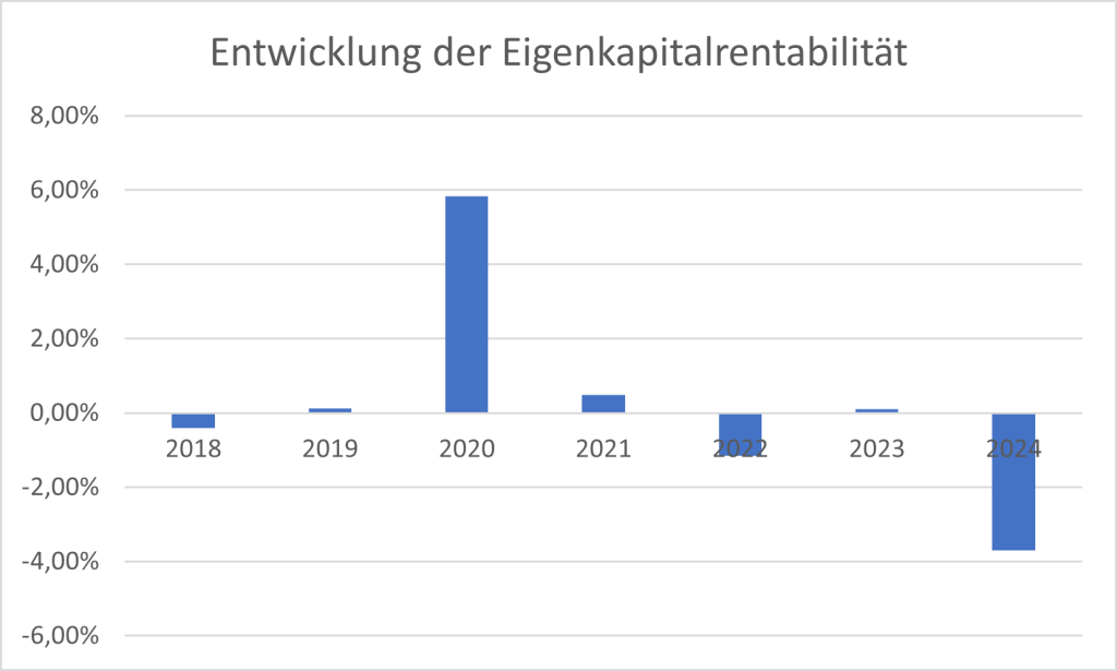 Die Eigenkapitalrentabilität entwickelte sich im Betrachtungszeitraum insgesamt sehr volatil. Nach einer leicht negativen Rendite im Jahr 2018 verzeichnete die Kennzahl bis zum Jahr 2020 einen deutlichen Anstieg um mehr als sechs Prozentpunkte. Ab dem Jahr 2021 verschlechterte sich die Ertragslage erneut, sodass die Eigenkapitalrentabilität im Jahr 2022 auf –1,14 Prozent zurückging. Im Jahr 2023 konnte wieder eine leicht positive Verzinsung erzielt werden. Im Folgejahr kam es jedoch zu einem erneuten Rückgang um über drei Prozentpunkte. Mit einer Eigenkapitalrentabilität von –3,69 Prozent wurde im Jahr 2024 der bislang niedrigste Wert des gesamten Betrachtungszeitraums erreicht.