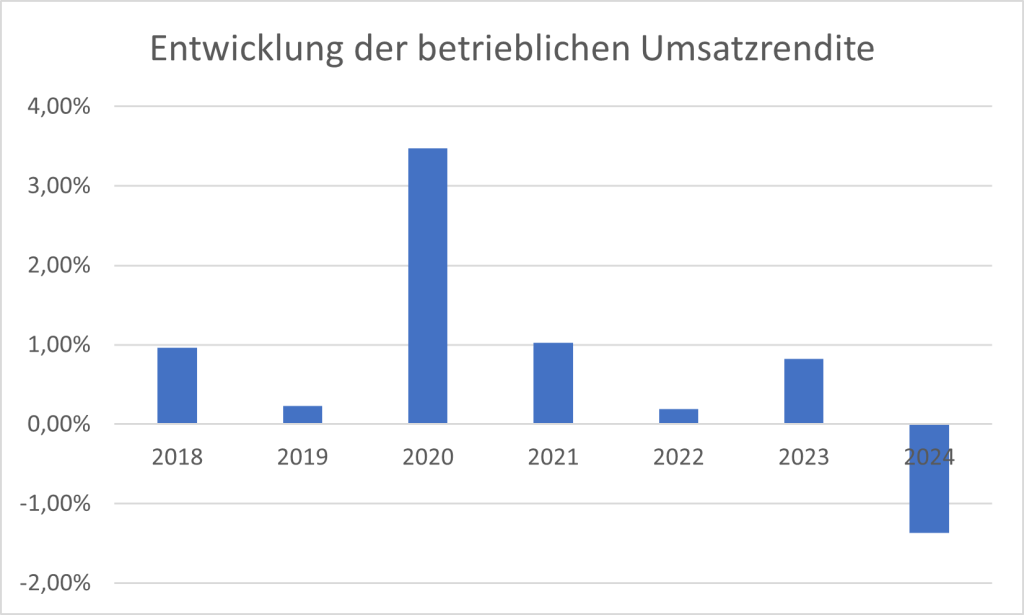 Die Entwicklung des wirtschaftlichen Ergebnisses spiegelt sich zunächst in der betrieblichen Umsatzrendite wider. Diese Kennzahl setzt das Betriebsergebnis ins Verhältnis zum Umsatz und dient somit als Indikator für die betriebswirtschaftliche Effizienz.