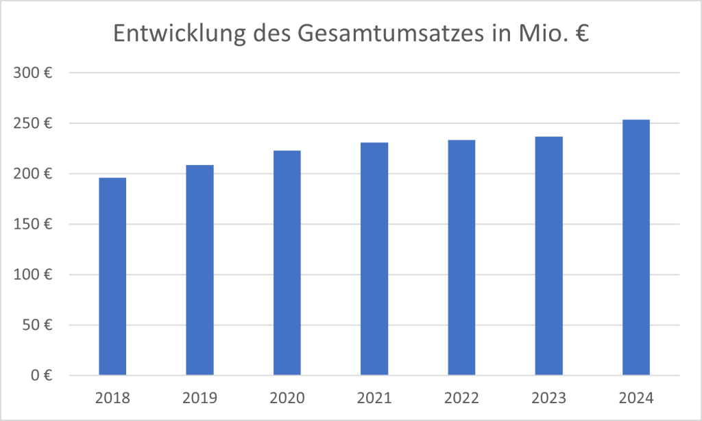 Der Gesamtumsatz der Elbe-Kliniken Stade-Buxtehude gGmbH stieg von 196 Mio. € im Jahr 2018 um rund 29 Prozent auf 254 Mio. € im Jahr 2024.