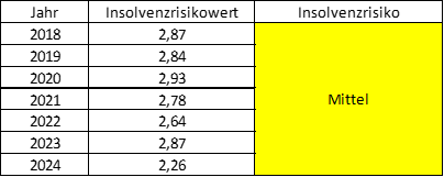 Der Insolvenzrisikowert misst das Risiko, dass ein Krankenhaus in den nächsten zwei Jahren in die Insolvenz geht. In die Berechnung des Insolvenzrisikowertes fließen Rendite- Liquiditäts- und Stabilitätskennzahlen ein. Ein Risikowert unter 2 kennzeichnet eine hohe Insolvenzgefahr, eine akute Gefährdung der Einrichtung. Bei einem Score zwischen 2 und 3 ist das Krankenhaus zwar nicht akut insolvenzgefährdet, jedoch von finanziellen Schwierigkeiten bedroht. Ein Score über 3 kennzeichnet ein finanziell solides Krankenhaus.