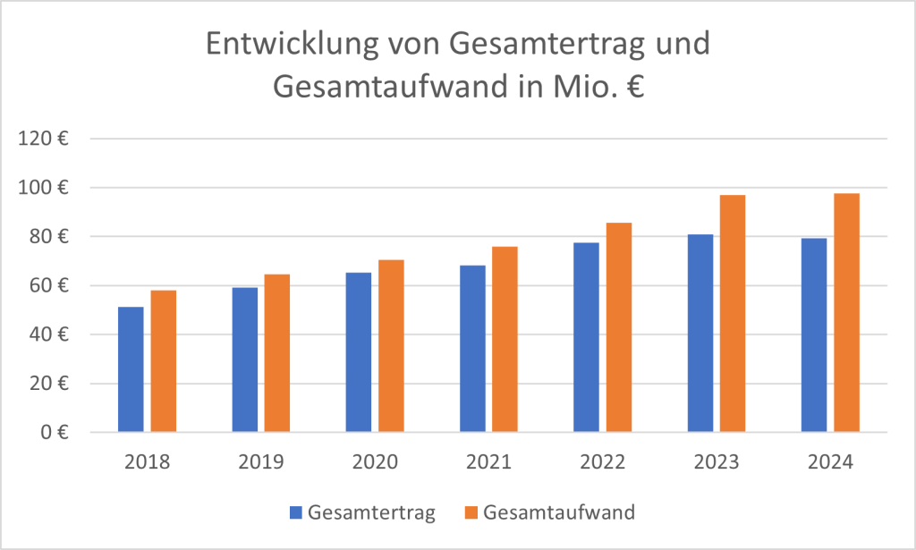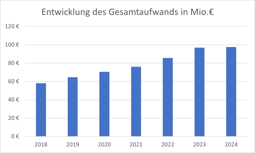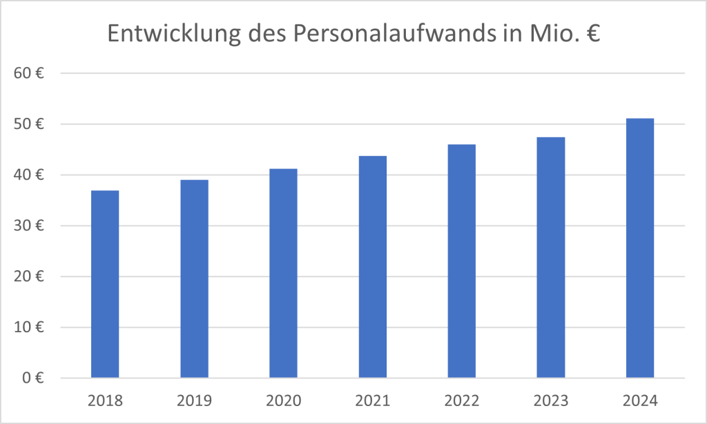 Der Personalaufwand stellt einen der wesentlichen Kostenfaktoren dar. Bedingt durch einen Anstieg der Beschäftigtenzahl und durch höhere Tarif-Entgelte ist der Personalaufwand von 37 Mio. € im Jahr 2018 um rund 39 Prozent auf 51 Mio. € im Jahr 2024 angewachsen.