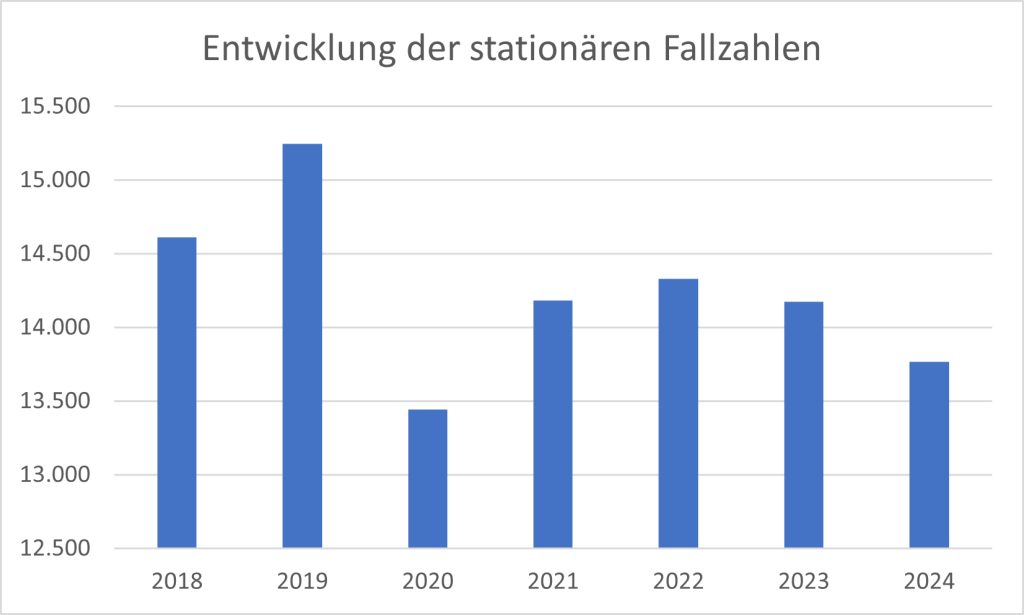 Infolge der Auswirkungen der Corona-Pandemie war im Jahr 2020 ein deutlicher Rückgang der Behandlungszahlen zu verzeichnen. Gegenüber dem Jahr 2019 verringerte sich die Zahl der stationär behandelten Patientinnen und Patienten um rund 12 Prozent. Im Jahr 2021 zeigte sich eine Erholung der Fallzahlen mit einem Anstieg um 5,5 Prozent. Das Jahr 2022 war hingegen erneut von einem Rückgang der stationären Behandlungsfälle um etwa 3 Prozent geprägt. Dieser rückläufige Trend setzte sich in den Jahren 2023 und 2024 fort: Die Zahl der stationären Aufnahmen nahm um 1 Prozent beziehungsweise 3 Prozent ab. Das bislang höchste Niveau von 15.247 stationären Aufnahmen im Jahr 2019 wurde seither nicht wieder erreicht.