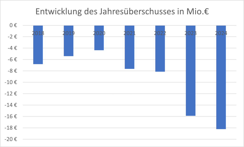 Die Aller-Weser-Kliniken gGmbH verzeichnete im gesamten Berichtszeitraum einen Jahresfehlbetrag. Besonders auffällig ist die erhebliche Verschlechterung des Jahresfehlbetrags, der sich zwischen 2022 und 2024 um mehr als 120 Prozent erhöht hat.