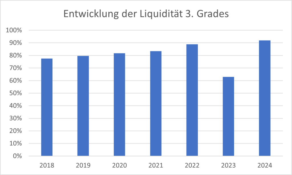 Der Liquiditätsgrad hat sich in dem Zeitraum von 2018 bis 2024 um 15 Prozentpunkte verbessert, dennoch lagen die Werte durchgehend unter der Mindestgrenze von 100 Prozent.