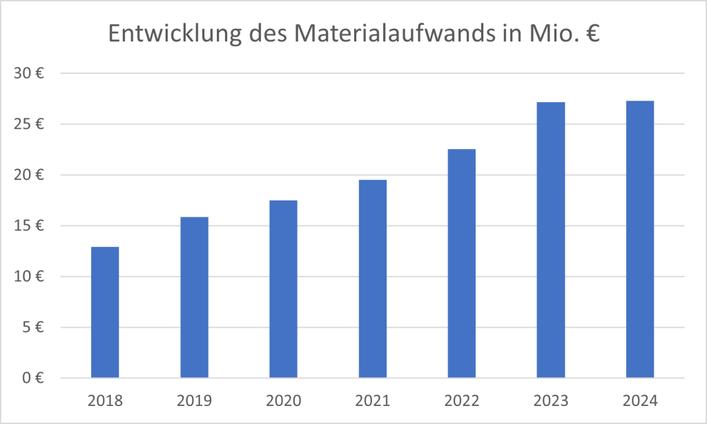 Ein maßgeblicher Treiber des Anstiegs des Gesamtaufwands war auch der Materialaufwand, der in dem Zeitraum von 2018 bis 2024 um über 100 Prozent zugenommen hat.