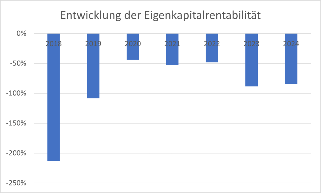 Die Aller-Weser-Kliniken gGmbH verzeichneten im Berichtszeitraum eine deutlich negative Eigenkapitalverzinsung. Zwar hat sich die Eigenkapitalrentabilität im Zeitraum von 2018 bis 2024 merklich verbessert, die erreichten Werte sind jedoch weiterhin als unbefriedigend zu bewerten. Die Ursachen dieser Entwicklung liegen einerseits in der anhaltend schwachen Ertragslage der Aller-Weser-Kliniken gGmbH und andererseits in der vergleichsweise geringen Eigenkapitalausstattung.