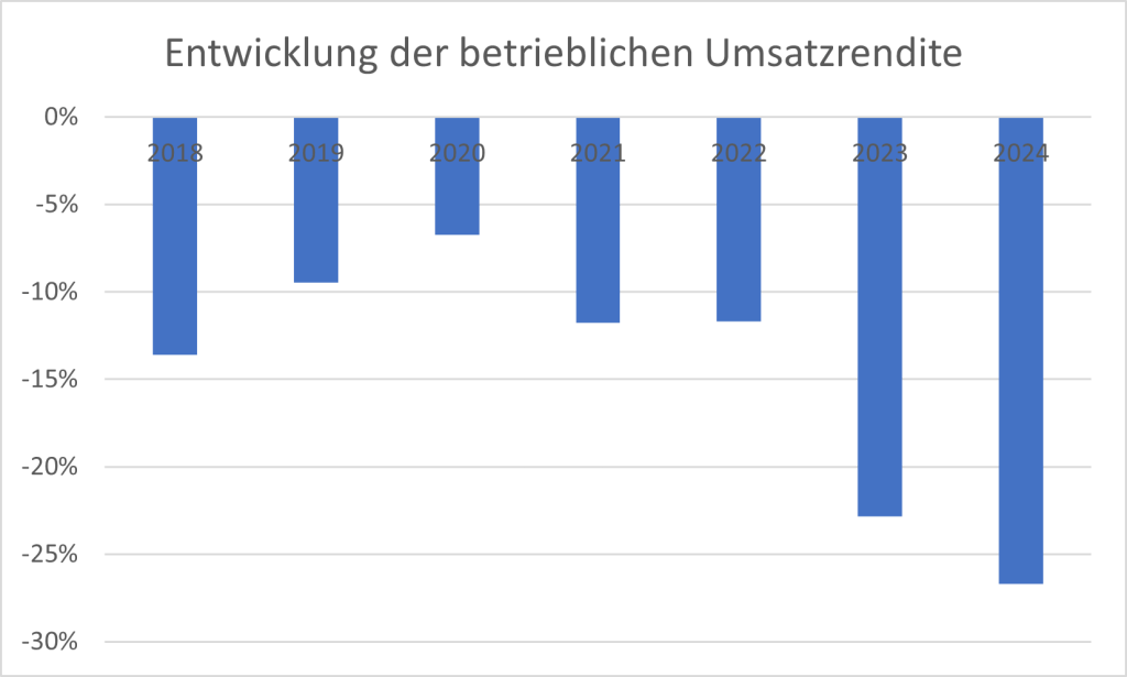 Analog zur Entwicklung des Betriebsergebnisses zeigte sich auch bei der betrieblichen Umsatzrendite ein deutlich negativer Verlauf. Mit –27 Prozent wurde im Jahr 2024 der niedrigste Wert des gesamten Analysezeitraums erreicht. Diese Entwicklung verdeutlicht die angespannte Ertragslage, die sich bereits im Betriebsergebnis widerspiegelte.