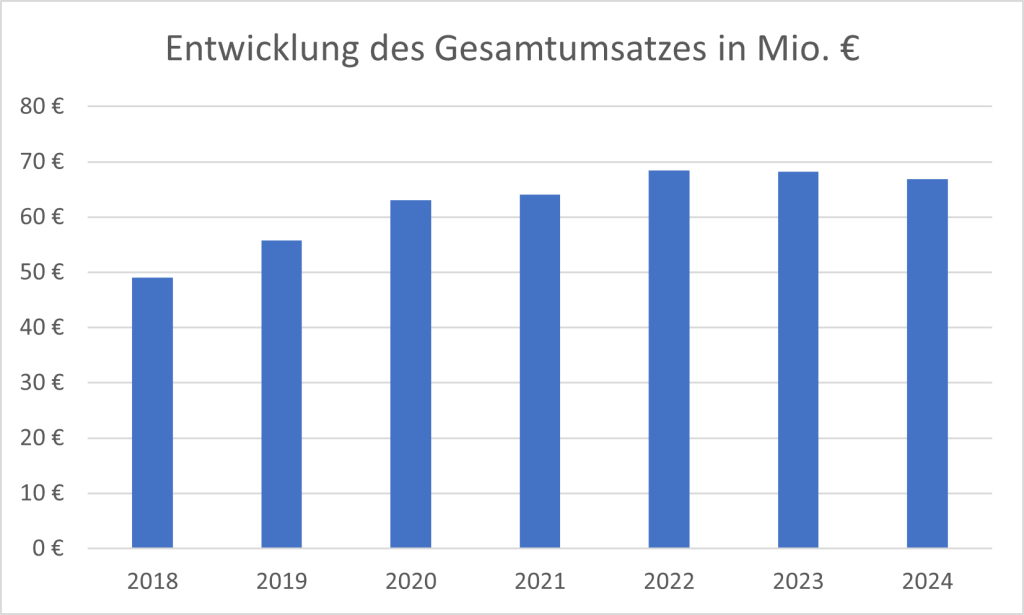 Der Gesamtumsatz der der Aller-Weser-Klinik gGmbH stieg von 49 Mio. € im Jahr 2018 um rund 36 Prozent auf 67 Mio. € im Jahr 2024.