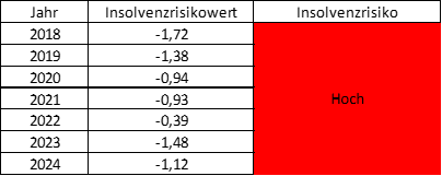 Der Insolvenzrisikowert misst das Risiko, dass ein Krankenhaus in den nächsten zwei Jahren in die Insolvenz geht. In die Berechnung des Insolvenzrisikowertes fließen Rendite-, Liquiditäts- und Stabilitätskennzahlen ein. Ein Risikowert unter 2 kennzeichnet eine hohe Insolvenzgefahr, eine akute Gefährdung der Einrichtung. Bei einem Score zwischen 2 und 3 ist das Krankenhaus zwar nicht akut insolvenzgefährdet, jedoch von finanziellen Schwierigkeiten bedroht. Ein Score über 3 kennzeichnet ein finanziell solides Krankenhaus.