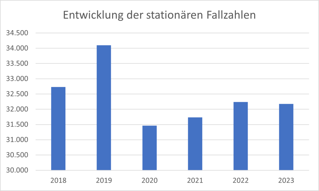 Vor der Corona-Pandemie nahmen die stationären Behandlungszahlen zu. So erhöhte sich die Zahl der aufgenommenen Patienten von 2018 auf 2019 um rund 4,17 %. Im Jahr 2020, dem ersten Jahr der Corona-Pandemie, sank die stationäre Fallzahl im Vergleich zum Vorjahr um rund 7,7 %. In den Jahren 2021 und 2022 stiegen die stationären Behandlungszahlen leicht um 0,86 % bzw. 1,58 %. Im Jahr 2023 blieb die Anzahl der stationären Aufnahmen im Vergleich zum Vorjahr nahezu unverändert.