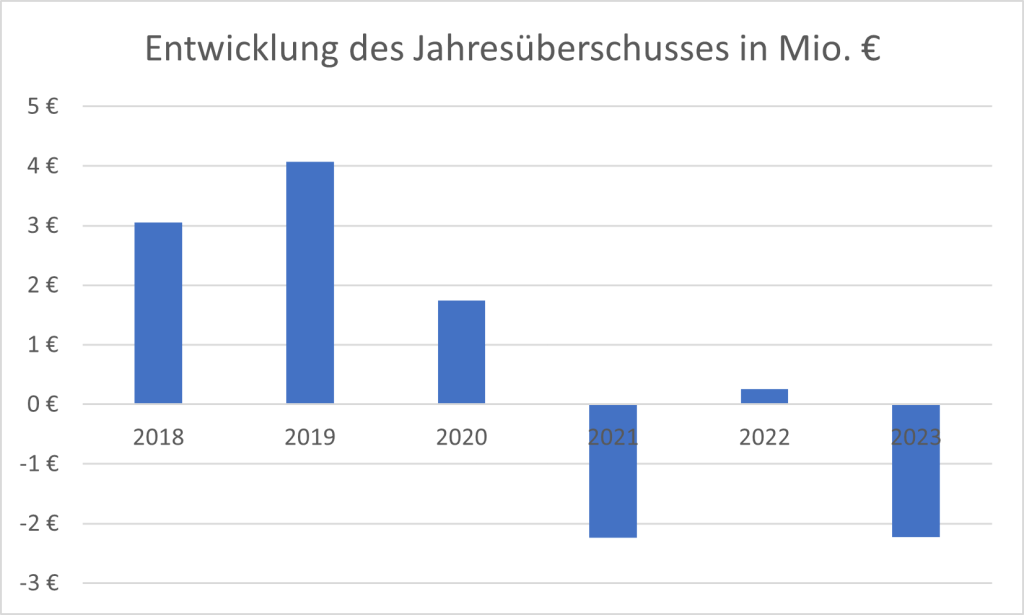 Der Jahresüberschuss verringerte sich in den Jahren 2018 bis 2020 um 33 %. Im Jahr 2021 geriet das Klinikum in die Verlustzone. Nach einer leichten Erholung im Jahr 2022 verzeichnete es im Jahr 2023 erneut einen Jahresfehlbetrag.