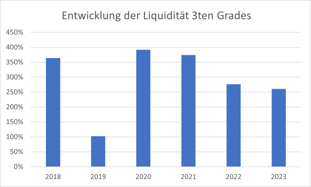 Die Entwicklung der Liquidität 3. Grades unterlag innerhalb des Berichtszeitraums erheblichen Schwankungen. Sie betrug im Mittel 295 % und liegt über den Mindestwert von 100 %.