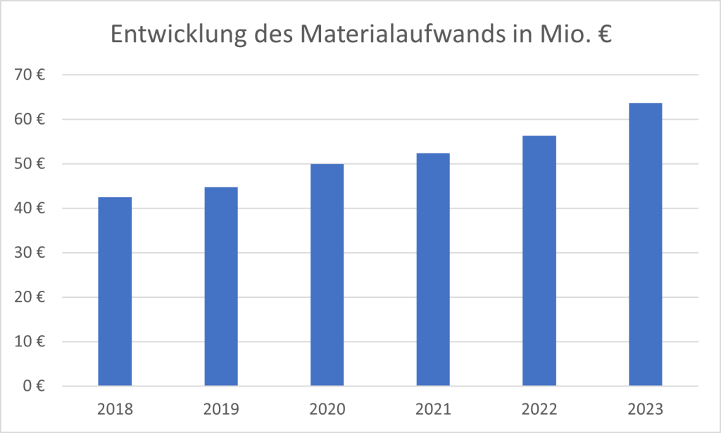 Ein weiterer wichtiger Einflussfaktor auf den Gesamtaufwand ist der Materialaufwand, der von 2018 auf 2023 um 49 % angestiegen ist.