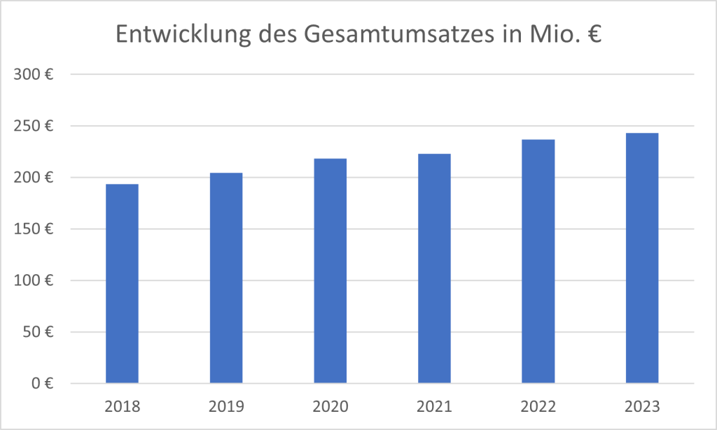 Der pandemiebedingte Abwärtstrend bei den Fallzahlen spiegelt sich nicht in der Umsatzentwicklung wider. Der Umsatz stieg von 194 Mio. € im Jahr 2018 um rund 26 % auf insgesamt 243 Mio. € im Jahr 2023. Der Grund für diese Entwicklung liegt in staatlichen Zuschüssen zur Kompensation der Folgen der Corona-Pandemie sowie in einem gestiegenen Landesbasisfallwert.