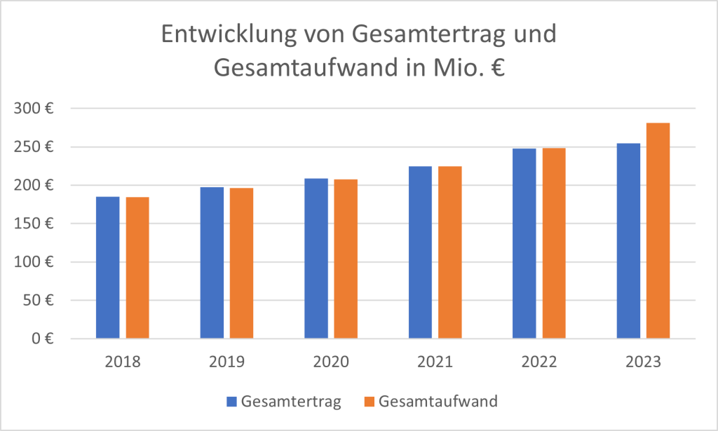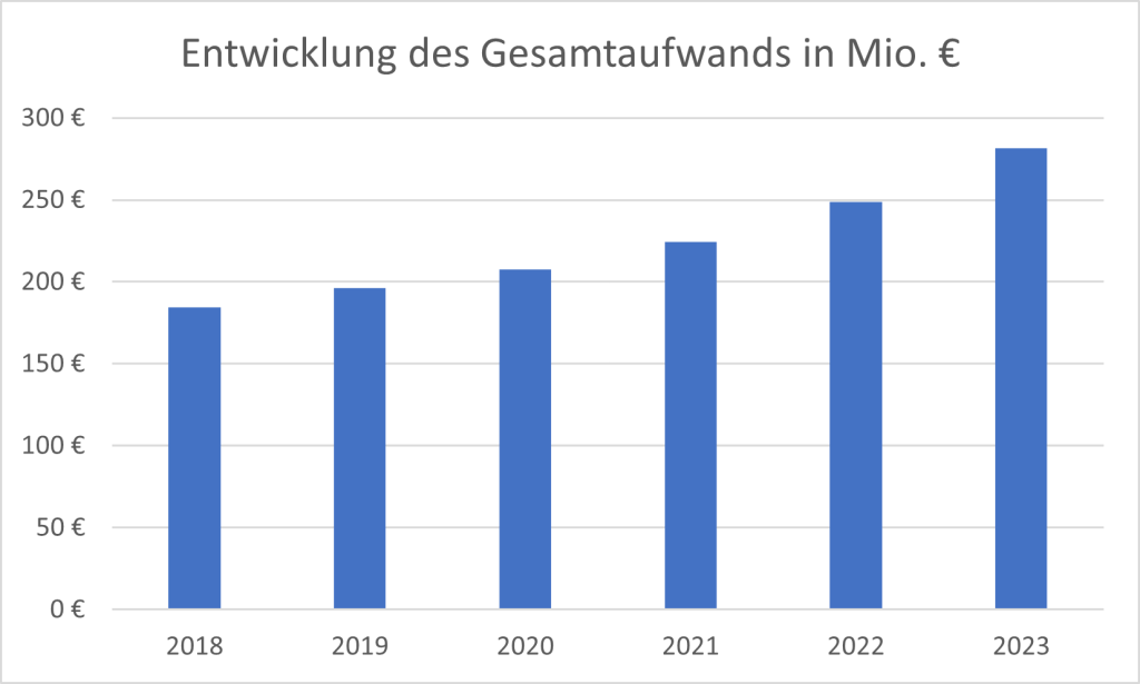 Einer der wesentlichen Kostenfaktoren ist der Personalaufwand. Diese ist von 93 Mio. € im Jahr 2018 um rund 40 % auf 130 Mio. € im Jahr 2023 gestiegen.