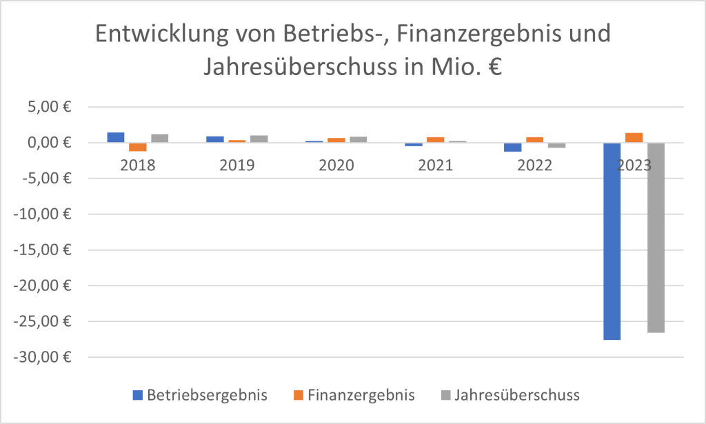 Die Entwicklung des Jahresüberschusses wurde maßgeblich durch den Verlauf des Betriebsergebnisses beeinflusst. Der Betriebsgewinn des Marienhospitals hat sich in den Jahren 2018 bis 2023 deutlich verringert, da die Aufwendungen – insbesondere für Personal und Material – stärker gestiegen sind als die Umsatzerlöse. Zusätzlich sind ab 2022 erhöhte Abschreibungen infolge des Bettenausbaus zu berücksichtigen.