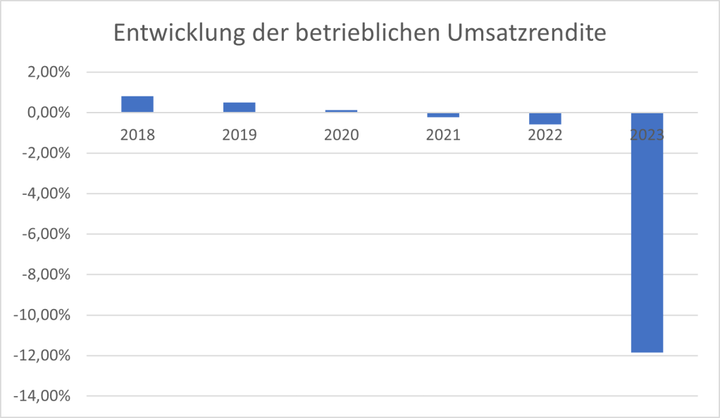 Die Entwicklung des wirtschaftlichen Ergebnisses spiegelt sich zunächst in der betrieblichen Umsatzrendite wider. Diese Kennzahl setzt das Betriebsergebnis ins Verhältnis zum Umsatz des Marienhospitals und dient somit als Indikator für die betriebswirtschaftliche Effizienz.