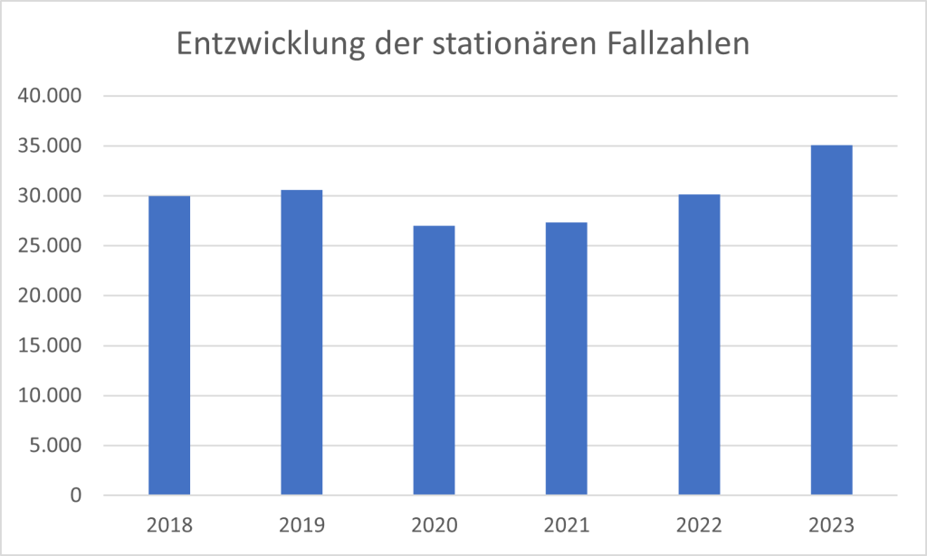 Vor der Corona-Pandemie waren die stationären Behandlungszahlen leicht im Wachstum begriffen. Im Jahr 2020, dem ersten Jahr der Corona-Pandemie, sank die stationäre Fallzahl im Vergleich zum Vorjahr um rund 12 %. Im Jahr 2021 wuchsen die stationären Behandlungszahlen leicht um 1 %. Insbesondere durch die Erhöhung der Bettenzahl im Jahr 2022 konnte die Zahl der stationären Aufnahmen in den Jahren 2022 und 2023 deutlich um 10% bzw. 16 % gesteigert werden.