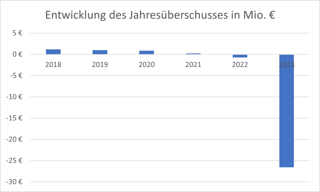 Der Jahresüberschuss des Marienhospitals hat sich innerhalb des Berichtszeitraums deutlich verringert. Im Jahr 2022 geriet das Krankenhaus in die Verlustzone. Bemerkenswert ist, dass sich der Jahresfehlbetrag im Jahr 2023 im Vergleich zum Vorjahr um über 25 Mio. € erhöht hat.