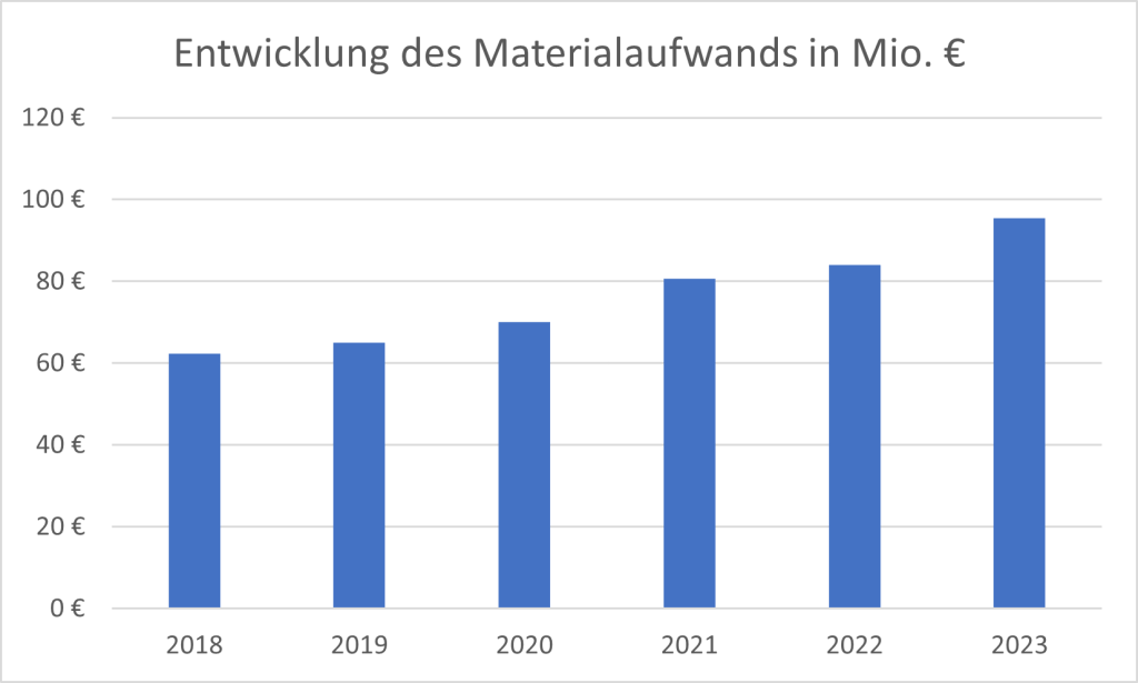 Ein weiterer wichtiger Einflussfaktor auf den Gesamtaufwand ist der Materialaufwand, der von 2018 auf 2023 um 53 % angestiegen ist.