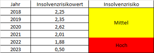 Der Insolvenzrisikowert misst das Risiko, dass ein Krankenhaus in den nächsten zwei Jahren in die Insolvenz geht. In die Berechnung des Insolvenzrisikowertes fließen Rendite-, Liquiditäts- und Stabilitätskennzahlen ein. Ein Risikowert unter 2 kennzeichnet eine hohe Insolvenzgefahr, eine akute Gefährdung der Einrichtung. Bei einem Score zwischen 2 und 3 ist das Krankenhaus zwar nicht akut insolvenzgefährdet, jedoch von finanziellen Schwierigkeiten bedroht. Ein Score über 3 kennzeichnet ein finanziell solides Krankenhaus.