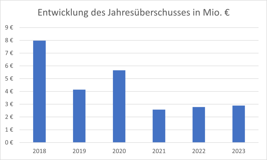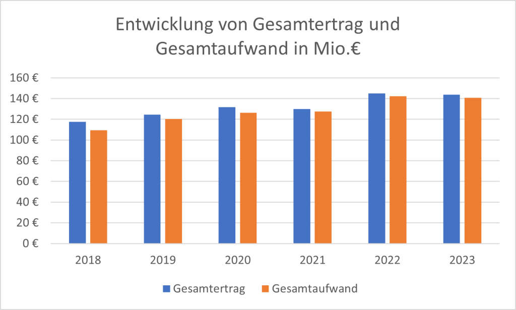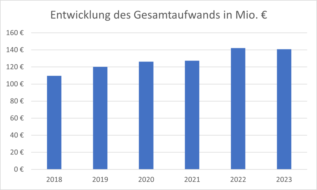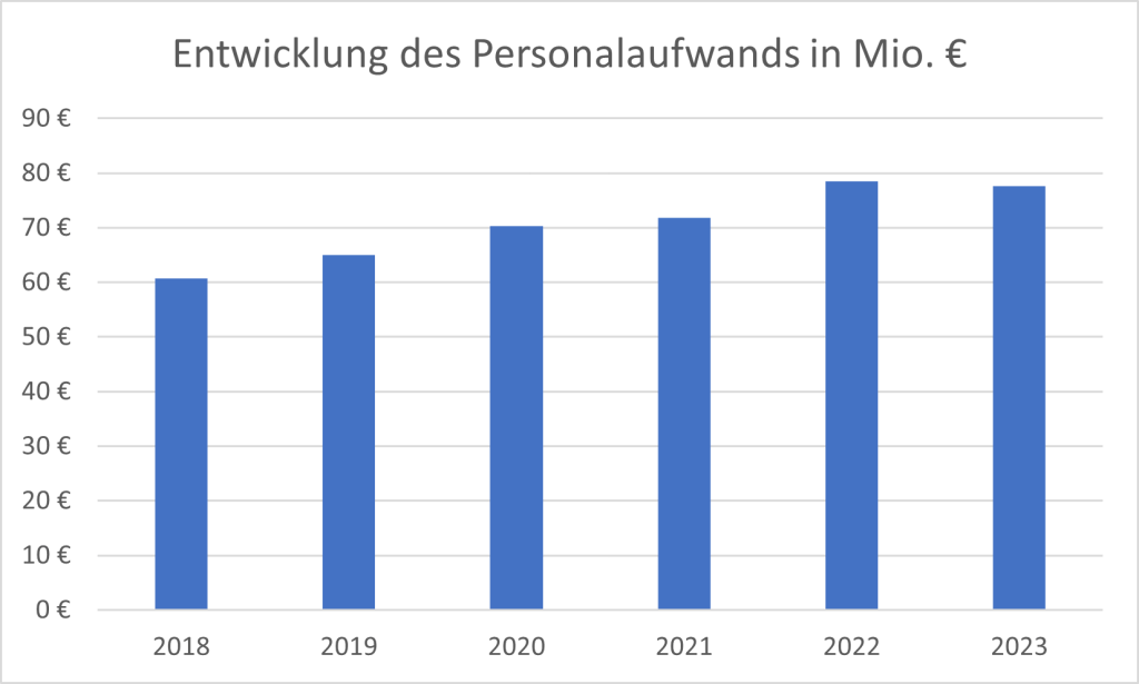 Einer der wesentlichen Kostenfaktoren ist der Personalaufwand. Diese ist von 61 Mio. € im Jahr 2018 um rund 28 % auf 78 Mio. € im Jahr 2023 gestiegen.
