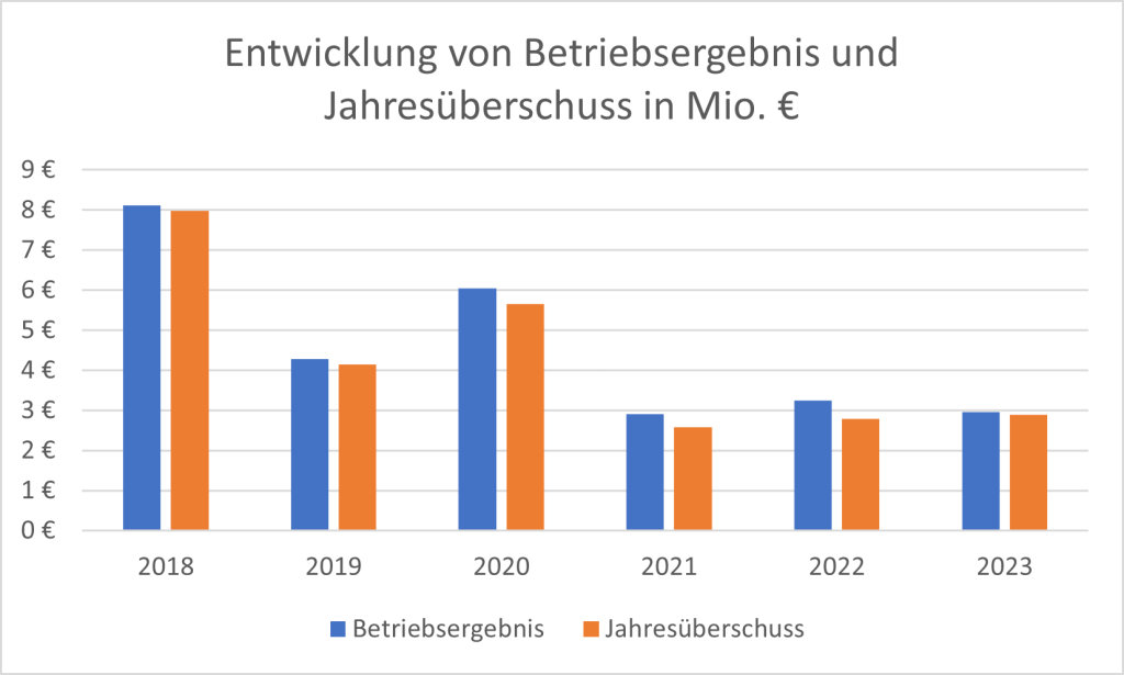 Die Entwicklung des Jahresüberschusses wurde maßgeblich durch den Verlauf des Betriebsergebnisses beeinflusst. Der Betriebsgewinn des Ammerland-Klinik ist in den Jahren 2018 bis 2023 deutlich geschrumpft, da die Aufwendungen – insbesondere für Personal und Material – stärker gestiegen sind als die Umsatzerlöse.
