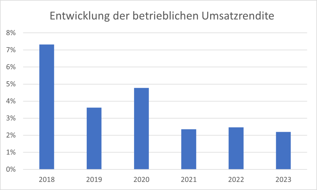 Die Entwicklung des wirtschaftlichen Ergebnisses spiegelt sich zunächst in der betrieblichen Umsatzrendite wider. Diese Kennzahl setzt das Betriebsergebnis ins Verhältnis zum Umsatz der Ammerland-Klinik und dient somit als Indikator für die betriebswirtschaftliche Effizienz.