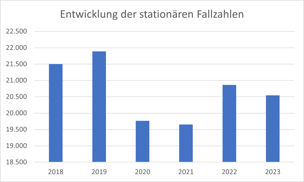 Im Jahr 2020, dem ersten Jahr der Corona-Pandemie, sank die stationäre Fallzahl im Vergleich zum Vorjahr um rund 10 %. Im Jahr 2021 waren die stationären Behandlungszahlen nahezu unverändert. Im Jahr 2022 konnte die Zahl der stationären Aufnahme um 6 % gesteigert werden. Das Jahr 2023 war wiederum mit einem leichten Rückgang verbunden. Abschließend betrachtet hat sich die stationäre Fallzahl von 2018 bis 2023 um rund 4 % verringert.