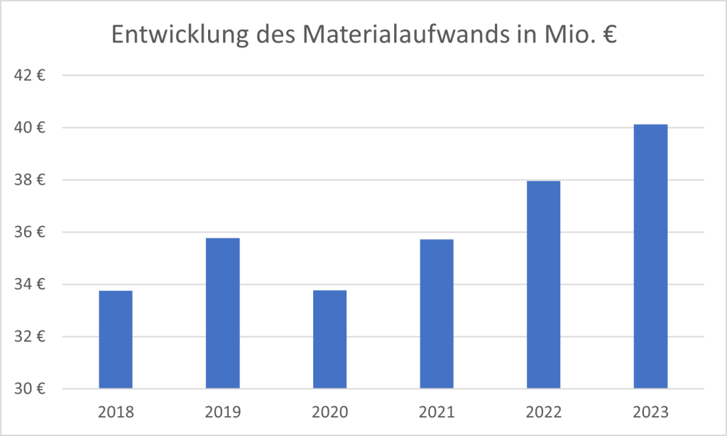 Ein weiterer wichtiger Einflussfaktor auf den Gesamtaufwand ist der Materialaufwand, der von 2018 auf 2023 um 19 % angestiegen ist. Die Auswirkungen der Corona-Pandemie und des Ukraine-Krieges haben den Materialeinsatz leicht erhöht.