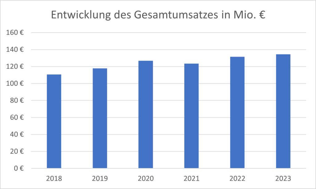 Der Gesamtumsatz stieg von 111 Mio. € im Jahr 2018 um rund 21 % auf insgesamt 134 Mio. € im Jahr 2023. Der pandemiebedingte Abwärtstrend bei den Fallzahlen spiegelt sich nicht in der Umsatzentwicklung wider. Der Grund hierfür liegt in den staatlichen Zuschüssen zur Kompensation der Folgen der Corona-Pandemie. Zudem ist ein gestiegener Landesbasisfallwert zu berücksichtigen.