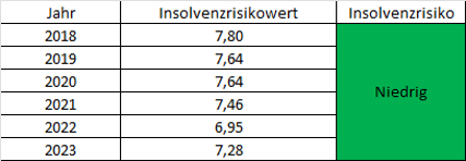 Der Insolvenzrisikowert misst das Risiko, dass ein Krankenhaus in den nächsten zwei Jahren in die Insolvenz geht. In die Berechnung des Insolvenzrisikowertes fließen Rendite-, Liquiditäts- und Stabilitätskennzahlen ein. Ein Risikowert unter 2 kennzeichnet eine hohe Insolvenzgefahr, eine akute Gefährdung der Einrichtung. Bei einem Score zwischen 2 und 3 ist das Krankenhaus zwar nicht akut insolvenzgefährdet, jedoch von finanziellen Schwierigkeiten bedroht. Ein Score über 3 kennzeichnet ein finanziell solides Krankenhaus.