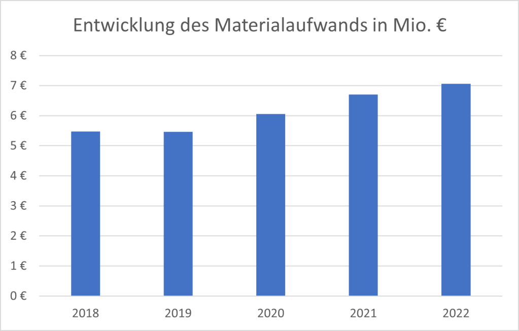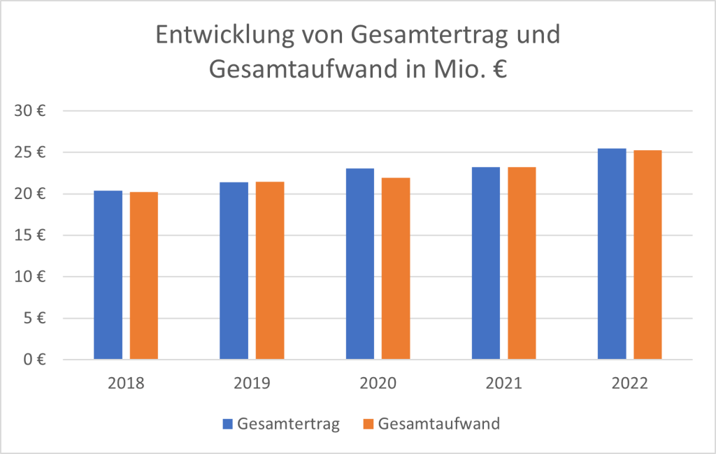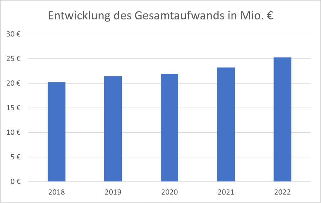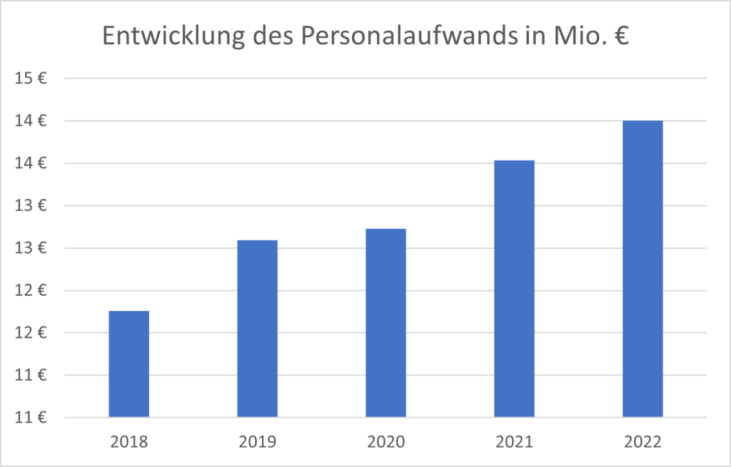 Einer der wesentlichen Kostenfaktoren ist der Personalaufwand. Diese ist von 12 Mio. € im Jahr 2018 um rund 19 % auf 14 Mio. € im Jahr 2022 gestiegen.