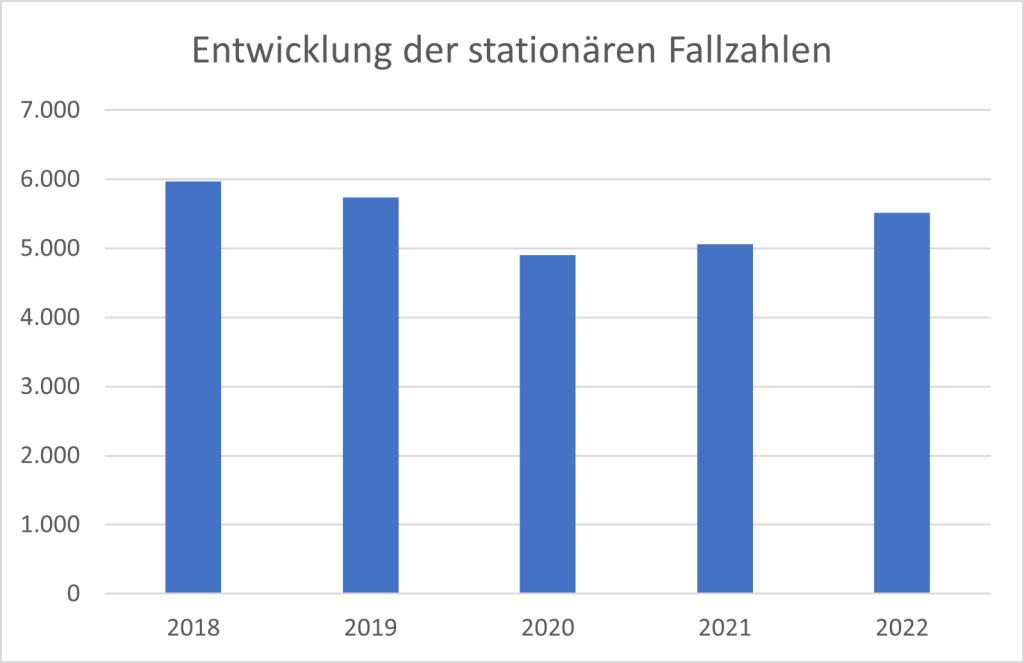 Die stationären Fallzahlen der St. Anna Klinik sind im Berichtszeitraum rückläufig gewesen. Während im Jahr 2018 noch 5.966 Patientinnen und Patienten stationär aufgenommen wurden, sank die Fallzahl bis 2023 um rund 8 % auf 5.517.