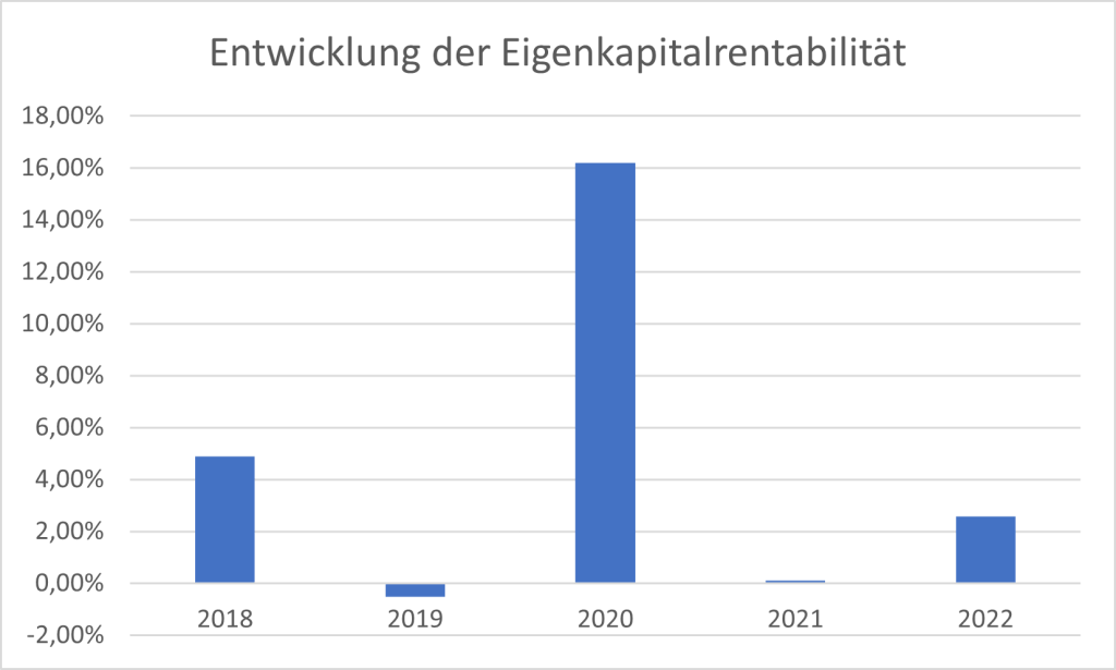 Die Eigenkapitalrentabilität setzt den Jahresüberschuss in Verhältnis zum Eigenkapital. Diese Kennzahl misst die Verzinsung des investierten Eigenkapitals. Wie auch die betriebliche Umsatzrendite hat sich die Eigenkapitalrentabilität der St. Anna Klinik wechselhaft entwickelt.