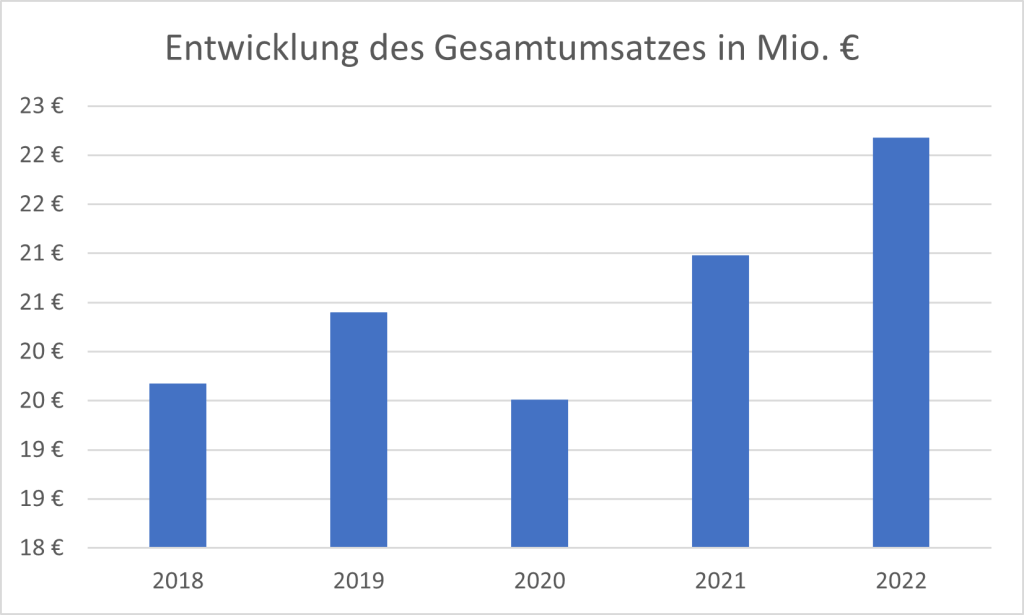 Die Entwicklung des Gesamtumsatzes verlief wechselhaft. Während in den Jahren 2018 und 2019 noch ein leichter Anstieg von 3,7 % zu verzeichnen war, ist im Jahr 2020 ein Rückgang von knapp 4 % festzustellen. Der pandemiebedingte Rückgang der Fallzahlen im Jahr 2020 spiegelt sich in der Umsatzentwicklung wider. Die staatlichen Zuschüsse zur Kompensation der Folgen der Corona-Pandemie zeigten in diesem Jahr keine stabilisierende Wirkung. In den Jahren 2021 und 2022 hingegen stieg der Gesamtumsatz um 7,55 % bzw. 5,70 %. Gründe hierfür dürften die steigenden Fallzahlen, die Corona-Fördermaßnahmen sowie ein gestiegener Landesbasisfallwert sein.