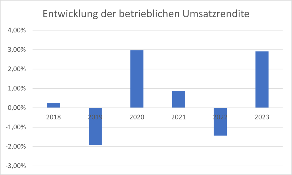 Die Entwicklung des wirtschaftlichen Ergebnisses spiegelt sich zunächst in der betrieblichen Umsatzrendite wider. Diese Kennzahl setzt das Betriebsergebnis ins Verhältnis zum Umsatz eines Krankenhauses und dient somit als Indikator für die betriebswirtschaftliche Effizienz.