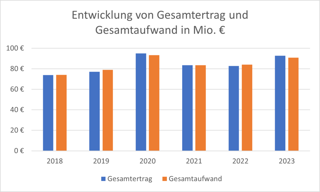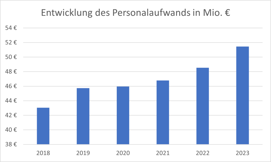 Einer der wesentlichen Kostenfaktoren ist der Personalaufwand. Diese ist von 43 Mio. € im Jahr 2018 um rund 19 % auf 51 Mio. € im Jahr 2023 gestiegen.