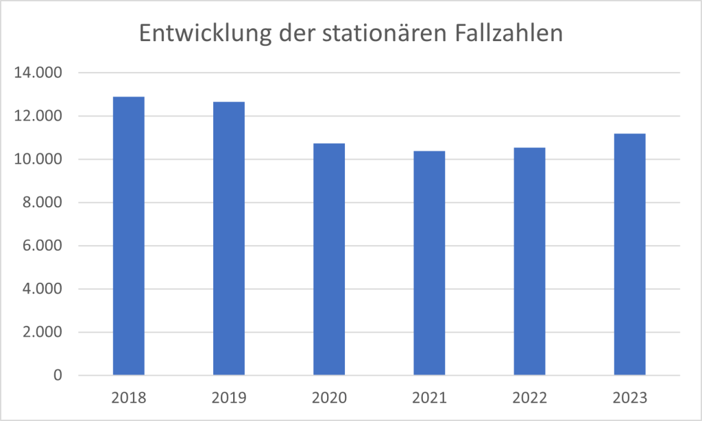 Im Jahr 2020, dem ersten Jahr der Corona-Pandemie, sank die stationäre Fallzahl im Vergleich zum Vorjahr deutlich um rund 15 %. Im Jahr 2021 fielen die stationären Behandlungszahlen leicht um rund 3 %. Im Jahr 2022 konnte die Zahl der stationären Aufnahme nur minimal gesteigert werden. Das Jahr 2023 war mit einem Wachstum der stationären Aufnahmen um rund 6 % verbunden. Abschließend betrachtet hat sich die stationäre Fallzahl von 2018 bis 2023 um rund 13 % verringert.