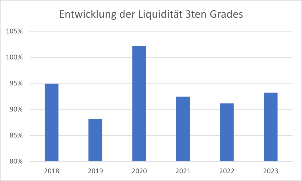 Die Liquidität 3. Grades unterlag innerhalb des Berichtszeitraums leichten Schwankungen. Der Median betrug bei 93 %, und liegt unter dem Mindestwert von 100 %.