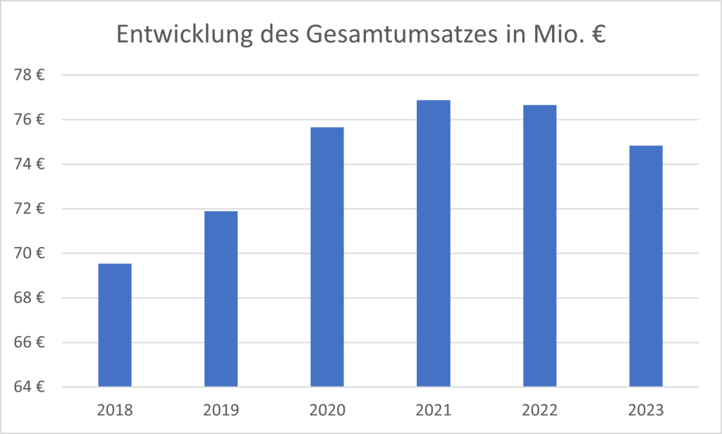 Der Gesamtumsatz stieg von 70 Mio. € im Jahr 2018 um rund 10 % auf insgesamt 77 Mio. € im Jahr 2022. Der pandemiebedingte Abwärtstrend bei den Fallzahlen spiegelt sich nicht in der Umsatzentwicklung wider. Der Grund hierfür liegt in den staatlichen Zuschüssen zur Kompensation der Folgen der Corona-Pandemie. Zudem ist ein gestiegener Landesbasisfallwert zu berücksichtigen. Das leichte Absinken des Umsatzes im Jahr 2023 ist durch die Verringerung des CMI zu begründen.