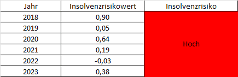 Der Insolvenzrisikowert misst das Risiko, dass ein Krankenhaus in den nächsten zwei Jahren in die Insolvenz geht. In die Berechnung des Insolvenzrisikowertes fließen Rendite-, Liquiditäts- und Stabilitätskennzahlen ein. Ein Risikowert unter 2 kennzeichnet eine hohe Insolvenzgefahr, eine akute Gefährdung der Einrichtung. Bei einem Score zwischen 2 und 3 ist das Krankenhaus zwar nicht akut insolvenzgefährdet, jedoch von finanziellen Schwierigkeiten bedroht. Ein Score über 3 kennzeichnet ein finanziell solides Krankenhaus.