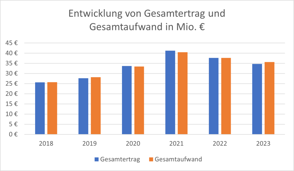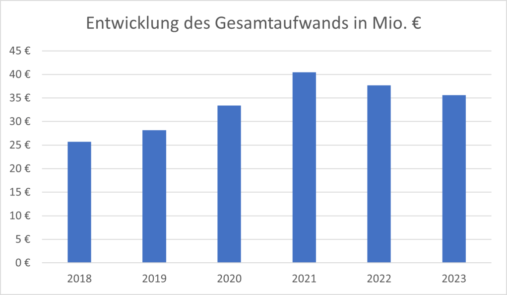 Einer der wesentlichen Kostenfaktoren ist der Personalaufwand. Diese ist von 16 Mio. € im Jahr 2018 um rund 11 % auf 18 Mio. € im Jahr 2023 gestiegen.