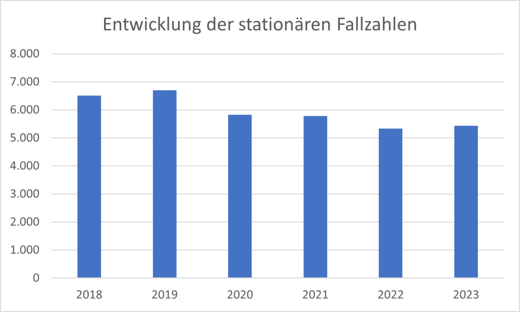 Die stationären Fallzahlen des St.-Marien-Hospitals sind im Berichtszeitraum rückläufig gewesen. Während im Jahr 2018 noch 6.512 Patientinnen und Patienten stationär aufgenommen wurden, betrug die stationäre Fallzahl im Jahr 2023 5.434.