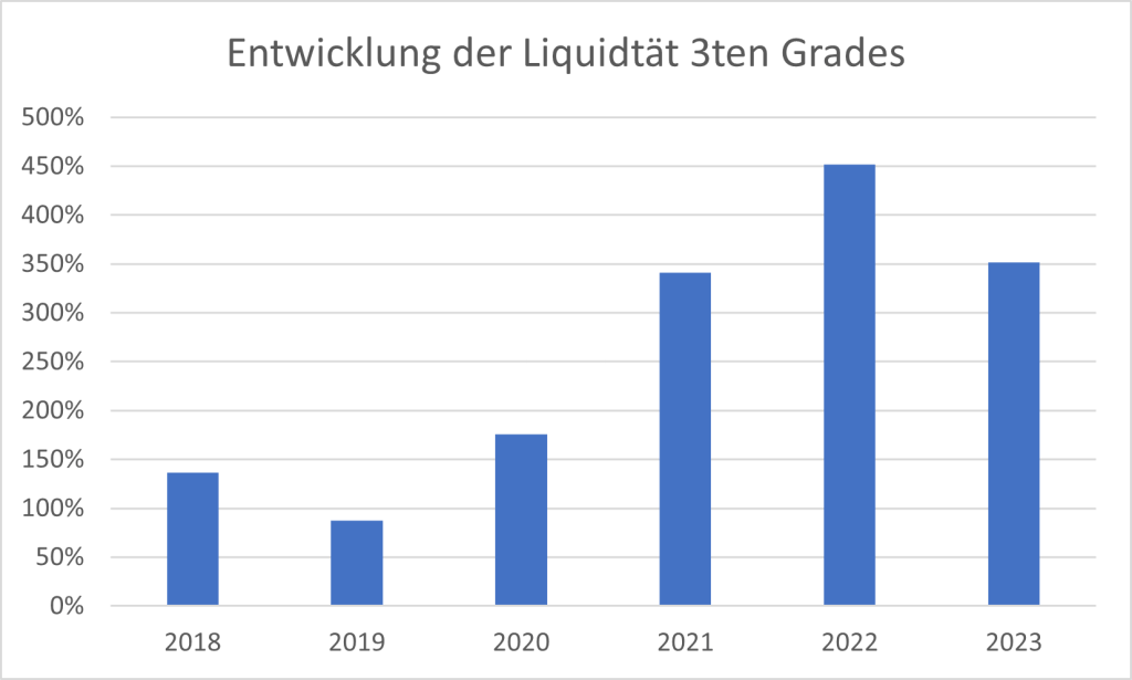 Die Liquidität 3. Grades unterlag im Berichtszeitraum erheblichen Schwankungen. Die deutliche Erhöhung in den Jahren 2022 und 2023 ist auf Stützungsmaßnahmen der Hauptgesellschafterin zurückzuführen. Der Median betrug bei 258 % und liegt über dem Mindestwert von 100 %.