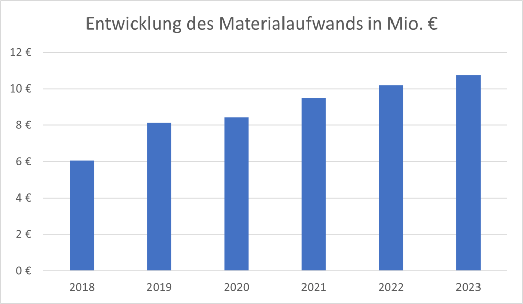 Ein weiterer wichtiger Einflussfaktor auf den Gesamtaufwand ist der Materialaufwand, der von 2018 auf 2023 um rund 78 % angestiegen ist.