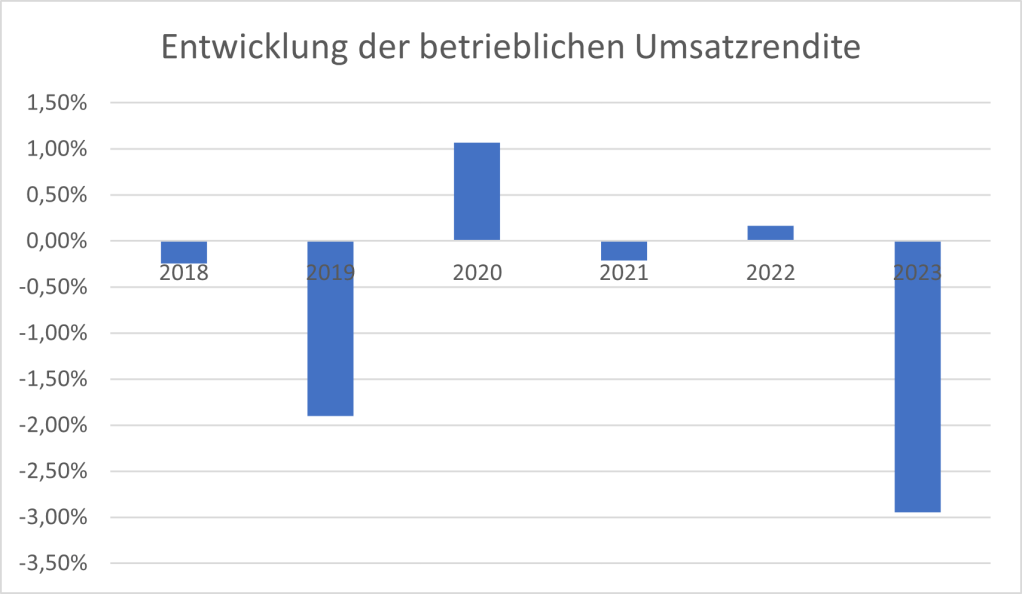 Die Entwicklung des wirtschaftlichen Ergebnisses spiegelt sich zunächst in der betrieblichen Umsatzrendite wider. Diese Kennzahl setzt das Betriebsergebnis ins Verhältnis zum Umsatz eines Krankenhauses und dient somit als Indikator für die betriebswirtschaftliche Effizienz.