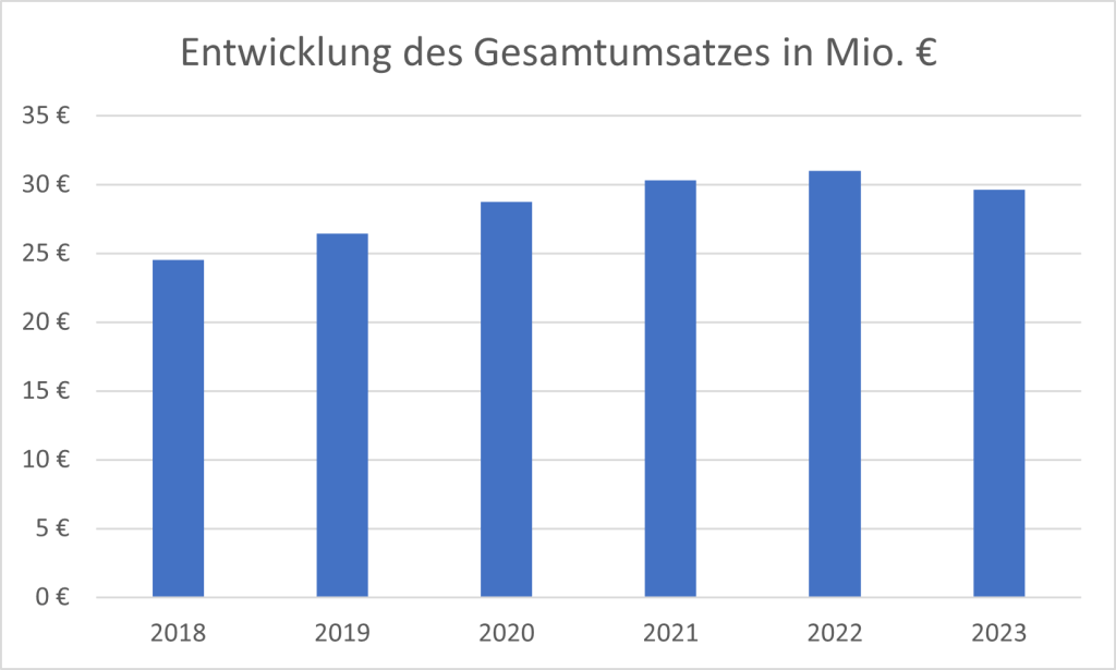 Der Gesamtumsatz stieg von 25 Mio. € im Jahr 2018 um rund 20 % auf insgesamt 30 Mio. € im Jahr 2023. Der Abwärtstrend bei den Fallzahlen spiegelt sich nicht in der Umsatzentwicklung wider. Der Grund hierfür liegt in den staatlichen Zuschüssen zur Kompensation der Folgen der Corona-Pandemie. Zudem ist ein gestiegener Landesbasisfallwert zu berücksichtigen.